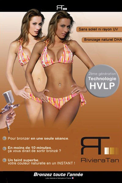 A l'aide d'un brumisateur à air de technologie HVLP 2ème génaration, la lotion RIVIERA TAN est appliquée sur le visage ou l'ensemble du corps halé, bronzé, trés bronzé... en fonction de votre humeur.